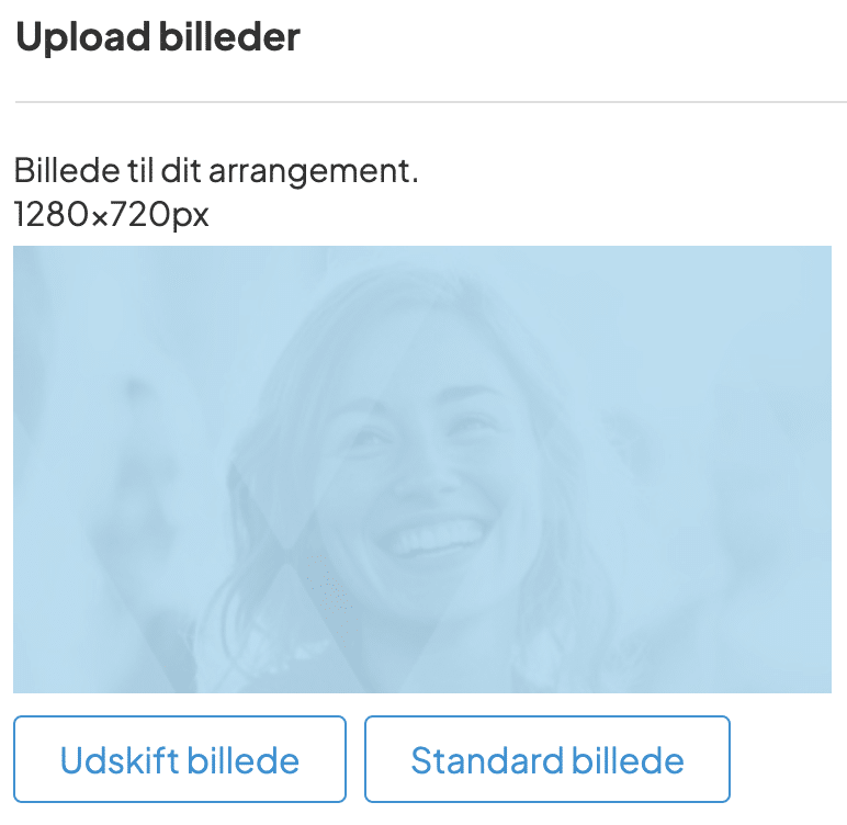 Vær opmærksom på, at jo flere KB/MB/GB billedet/billederne fylder, jo længere tid er siden på arrangementet om at loade. Dette kan derfor give en dårlig oplevelse hos billetkøberen, hvis billederne er for store og arrangementssiden loader langsomt.
