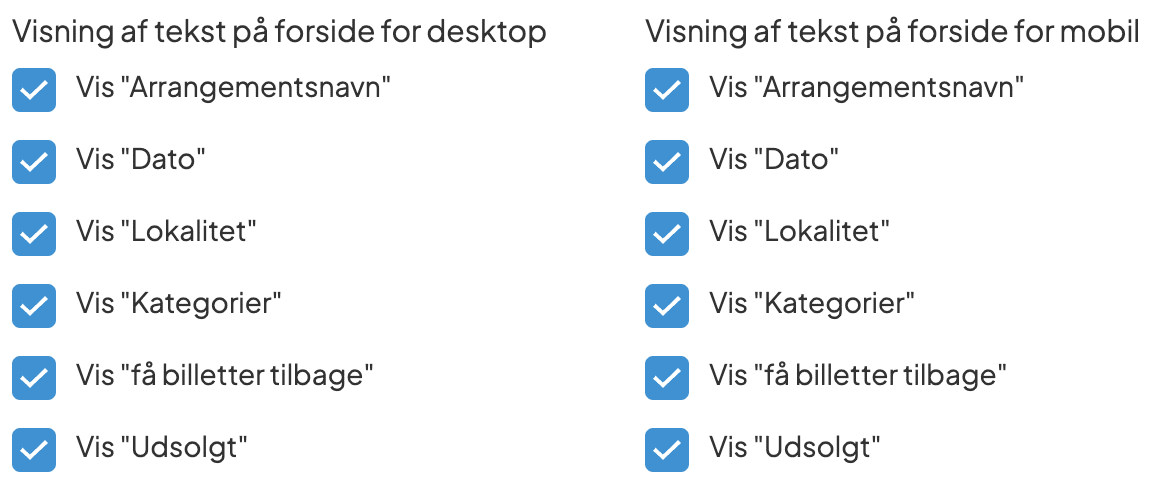 Vis/skjul i arrangementsoversigten er en mulighed for at vælge, hvilke forskellige informationer omkring dit arrangement, der skal vises eller skjules på forsiden i din billetshop. Forsiden er der, hvor du ser alle dine aktuelle arrangementet listet.