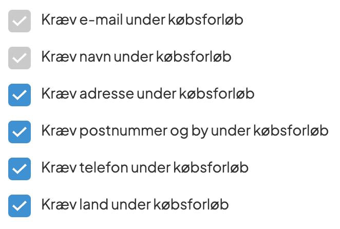 Du kan også vælge, hvilke kundeoplysninger du vil kræve ved billetkøb/tilmelding. Navn og emailadresse skal dog være slået til som standard, da Safeticket skal kunne sende en emailkvittering til deltageren på købet/tilmeldingen.