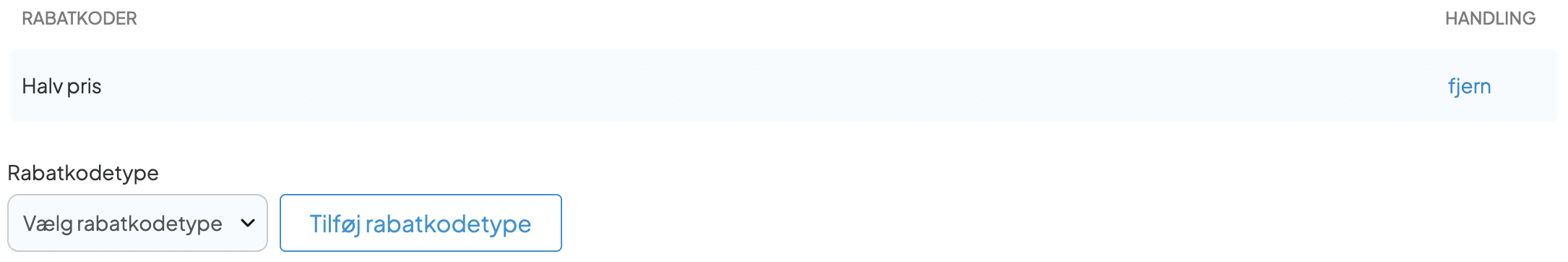 Rabatkoderne skal oprettes på forhånd under Opsætning > Arrangementer, hvor du kan definere rabatkodetypen. Derefter kan du tilføje den under fanen Rabatkoder.