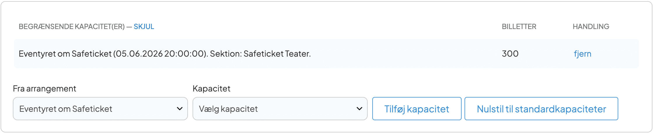 Kapaciteter fungerer på tværs af billettyper, og kan hjælpe dig med at sikre, at du aldrig samlet set kommer til at oversælge dit arrangement.