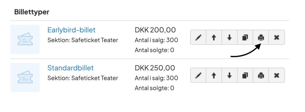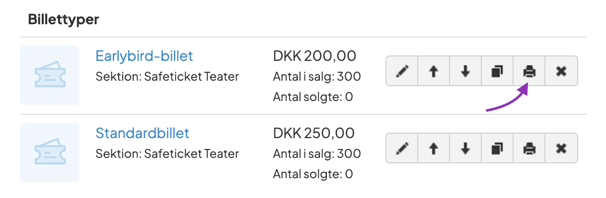 Du kan se et eksempel på din billettype ved at klikke på printer-ikonet ud for din billettype.