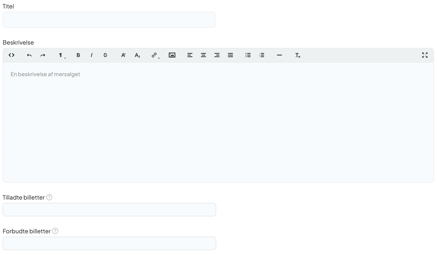| Billetpris* | Her kan du vælge, hvad billetten skal koste. Ved gratis tilmeldinger kan du blot angive prisen til 0kr. |