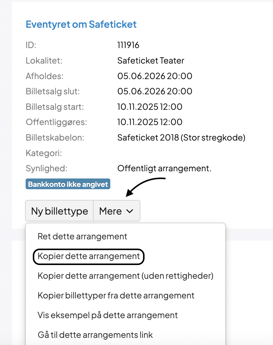 Hvis du for eksempel afholder flere arrangementer, der ligner hinanden, eller gentager det samme arrangement hvert år, kan du med fordel bruge kopieringsfunktionen i Safeticket. Her kan du nemt kopiere både arrangementer og billettyper.