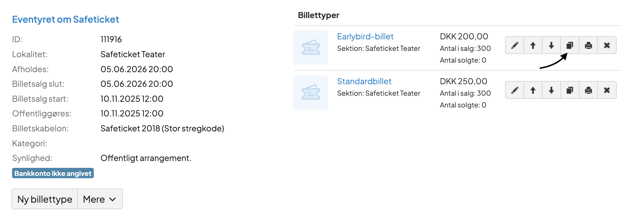 Gå til Opsætning > Arrangementer. Her skal du blot klikke på kopier-ikonet på billettypen, og så kan du kopiere den.