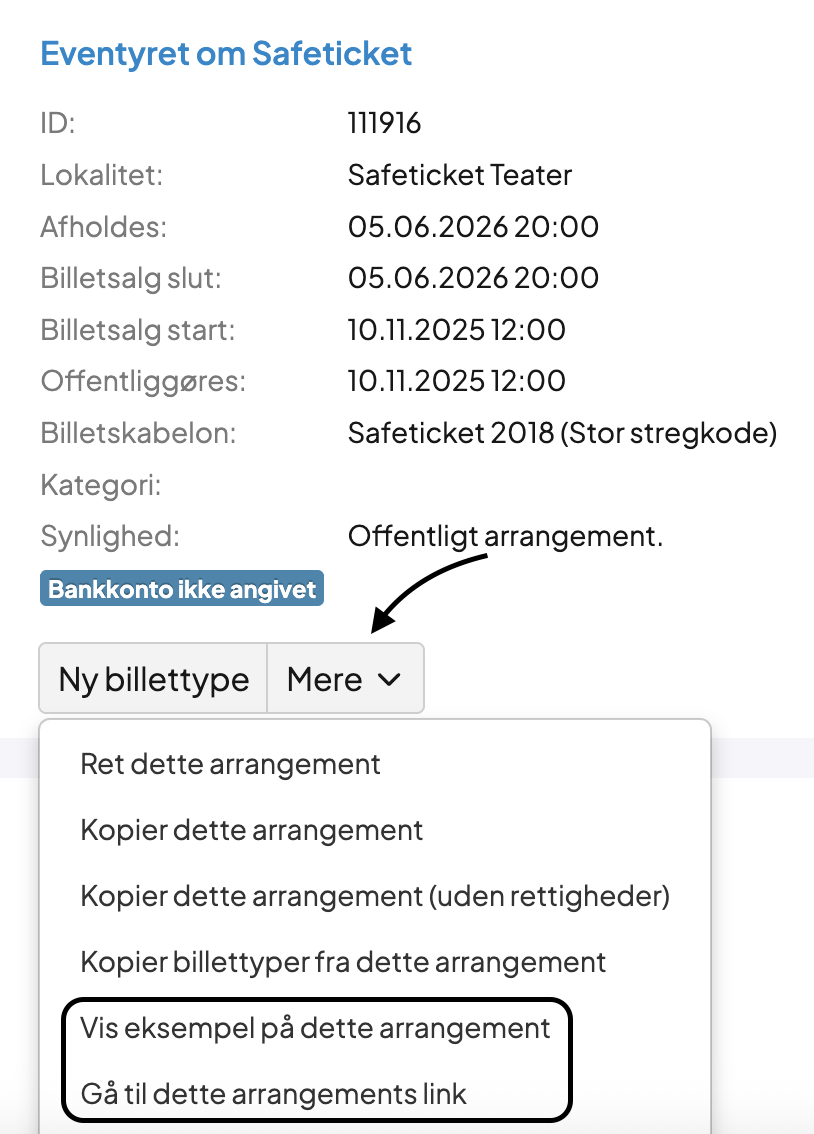 Du kan se et eksempel på dit arrangement under Opsætning > Arrangementer og klik på Mere ud for dit arrangement. Klik Vis eksempel for dette arrangement for at se et eksempel. Hvis dit billetsalg/din tilmelding er startet, kan du også prøve hele forløbet ved at klikke på Gå til dette arrangements link.