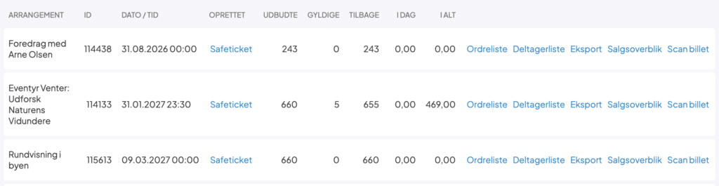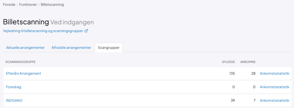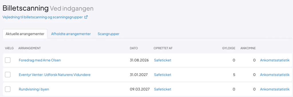 Her er det muligt at vælge at scanne billetter til et eller flere arrangementer af gangen, som om det var et og samme arrangement. Her er det også muligt at se, hvor mange der er solgt, og hvor mange af dem der er ankommet.