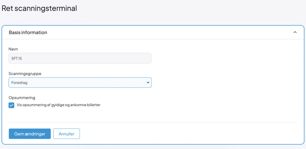 Når du er færdig med at rette indstillingerne på scanningsterminalen i systemet, skal du tænde for den fysiske scanningsterminal og opdatere opsætningen, før du er klar til at scanne billetter.
