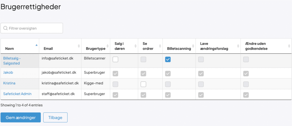 Her sætter du flueben i de rettigheder, der mangler ud for brugeren, feks. ved Billetscanning.