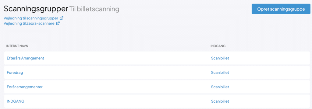 Ved at oprette en eller flere scanningsgrupper kan du nemt scanne billetter på tværs af arrangementer, flere arrangementer sammen eller kun udvalgte billettyper på flere arrangementer. Bruger du håndterminaler til at scanne med, skal du altid oprette en scanningsgruppe, som skal indstilles på scanningsterminalen.