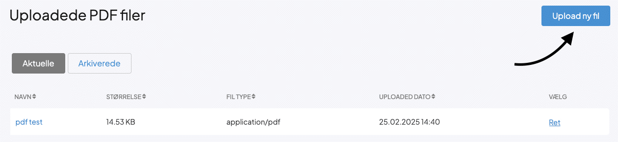 Når din PDF er klar, skal du under Opsætning > Filarkiv. Her kan du trykke Upload ny fil.