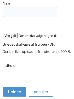 Når du uploader en fil, kan du navngive den, vælge filen, som skal være PDF og må max være 10 MB. Tryk herefter på Upload.