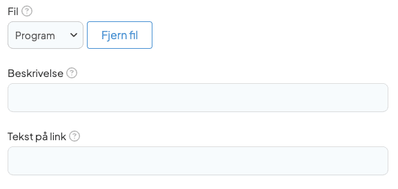 Klik Tilføj fil og vælg en Fil fra dropdown-listen. Du kan tilføje en Beskrivelse, der vises i kvitteringsmailen sammen med filen, samt den Tekst, der er på linket til filen. Hvis du skal tilføje flere filer, trykker du igen på Tilføj fil. Når du er færdig, gemmer du din billettype i bunden af siden.