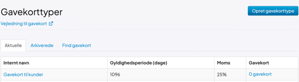 Når du har oprettet gavekorttypen, kommer du til oversigten over alle dine gavekorttyper. Her skal du trykke på 0 gavekort til højre på siden.