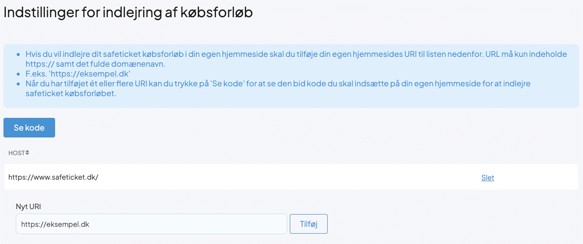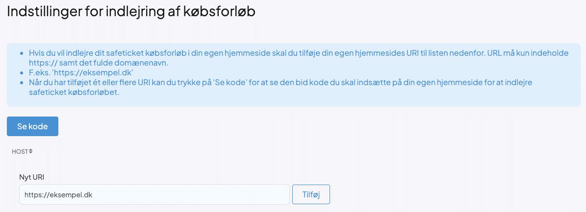 Her skal du indtaste din hjemmeside, som værende en host og trykke Tilføj. Du vil derefter kunne se den indtastede host på listen. Tilføjer du flere, vil de blot blive listet op. I eksemplet her er safeticket.dk indtastet i stedet for eksempel.dk.