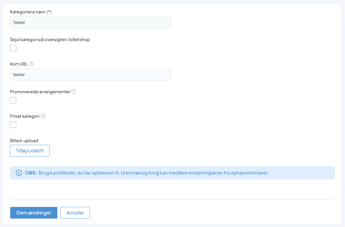 Når du har oprettet dine kategorier, skal du går under Opsætning > Arrangementer og rette dine arrangementer. Find Kategorier, nedenfor vil din specialkategori findes, og du har mulighed for at vælge en eller flere på dit arrangement. Husk at gemme ændringerne på dit arrangement.