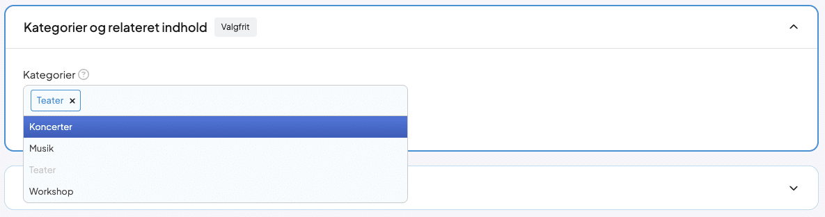 Her finder du fanen Kategorier og relateret indhold og vælger, hvilken eller hvilke kategorier dit arrangement skal kunne findes under.