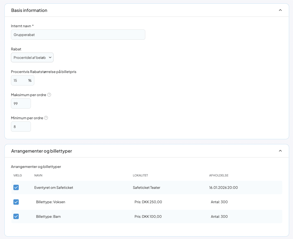 | Arrangementer og billettyper | Vælg hvilke af dine arrangementer eller kun udvalgte billettyper på dine arrangementer, hvor mængderabatten må være gyldig. |