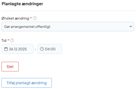 Her vælger du om den ønskede ændring skal gøre arrangementet offentligt, og bestemmer hvilket tidspunkt ændringen skal ske på.
