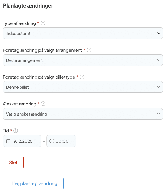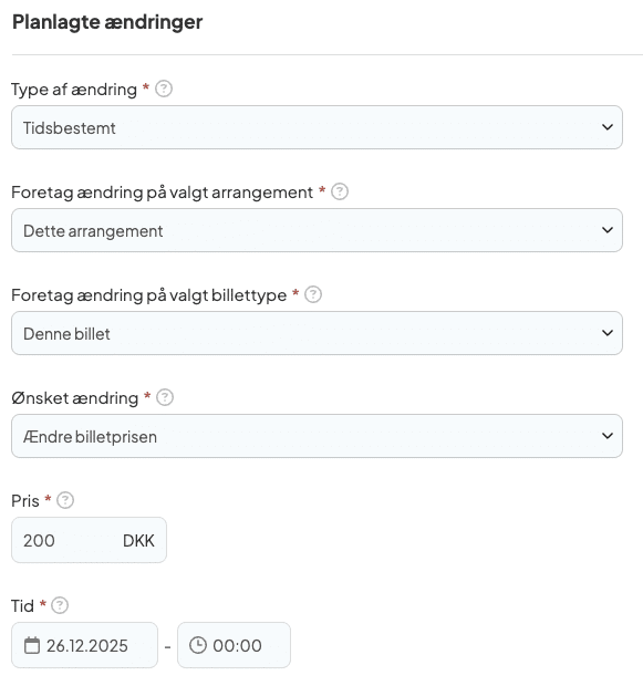 Du kan lave planlagte ændringer, der kun påvirker den enkelte billettype, som især er relevant, hvis du har flere forskellige salgs billettyper på samme arrangement, hvor de ikke nødvendigvis er i salg på samme tid. Du kan både lave tidsbestemte og hændelsesbestemte ændringer.
