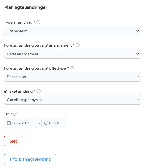 Skal du lave en ændring, der kun gælder for enkelte billettyper, skal til gå til Opsætning -> Arrangementer > klikke på billettypens navn for at redigere billettypen > rul ned til fanen Avancerede indstillinger og klik på knappen Tilføj planlagt ændring.