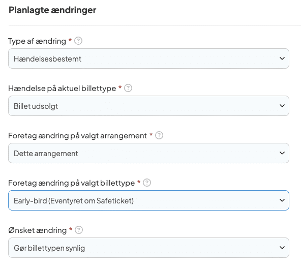 En hændelsesbestemt planlagt ændring er, hvis noget bestemt aktiverer ændringen. Et eksempel kan være, at en bestemt billettype kun skal sættes i salg, hvis en anden billettype bliver udsolgt eller kun har få billetter tilbage. Det kan være for at fylde en sal op fra en ene ende, så du ikke manuelt skal begrænse pladserne og holde øje med billetsalget. Et andet eksempel kan være, at de første 10 billetter sælges til en bestemt pris, og derefter sælges resten af billetterne til en anden pris.