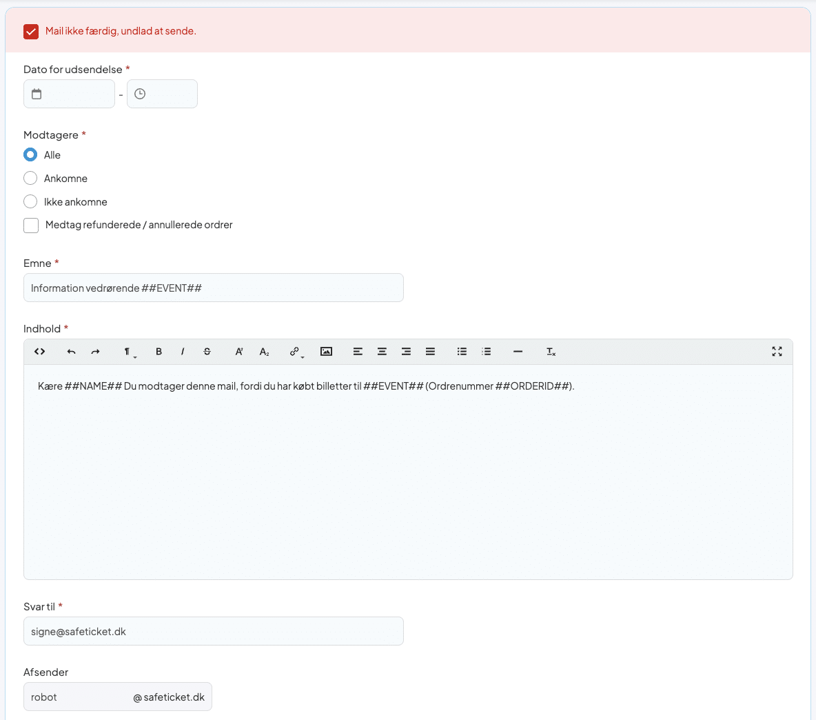 - Udfyld Emne og Indhold med de informationer, du har behov for. Hvis du lader ##EVENT## stå og ##ORDERID## skal disse automatisk sende ud med den rigtige information ud fra det arrangement, du tilføjer nederst.