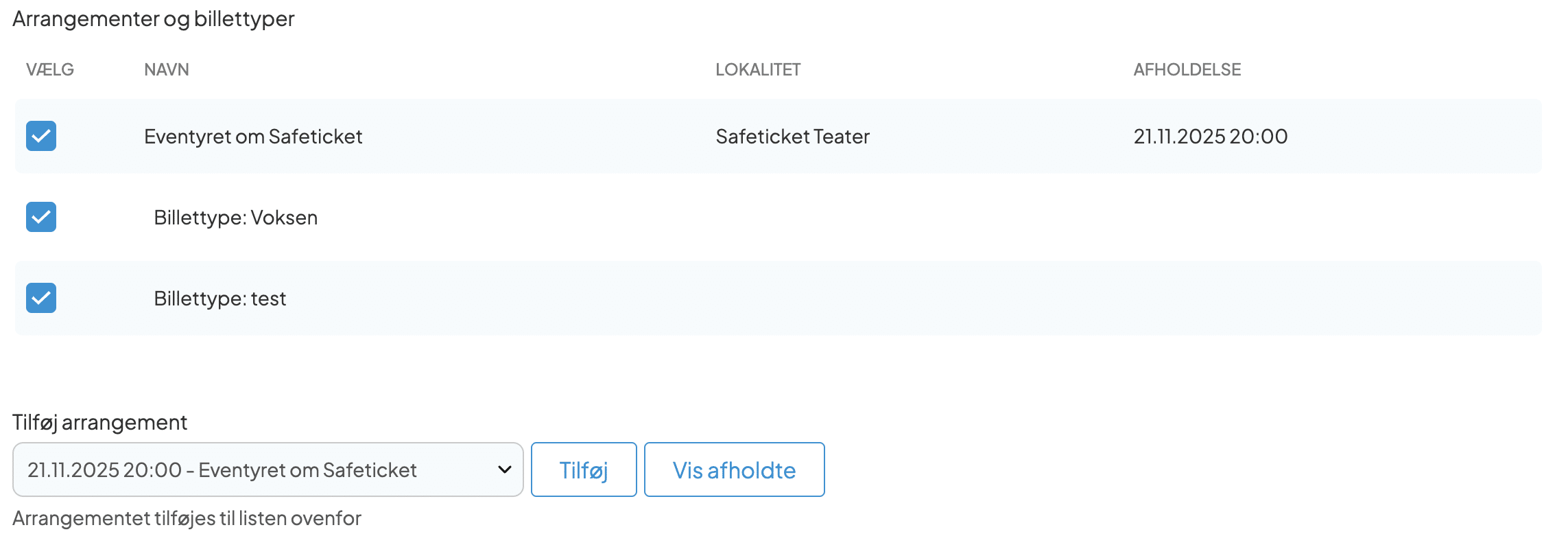 Når du har valgt et arrangement, ser det således ud: