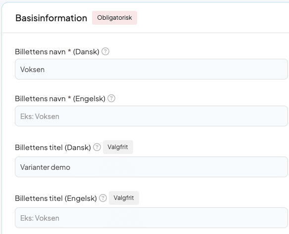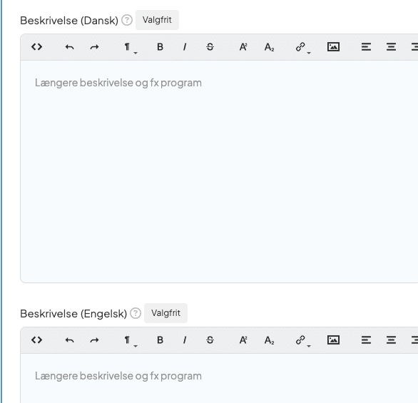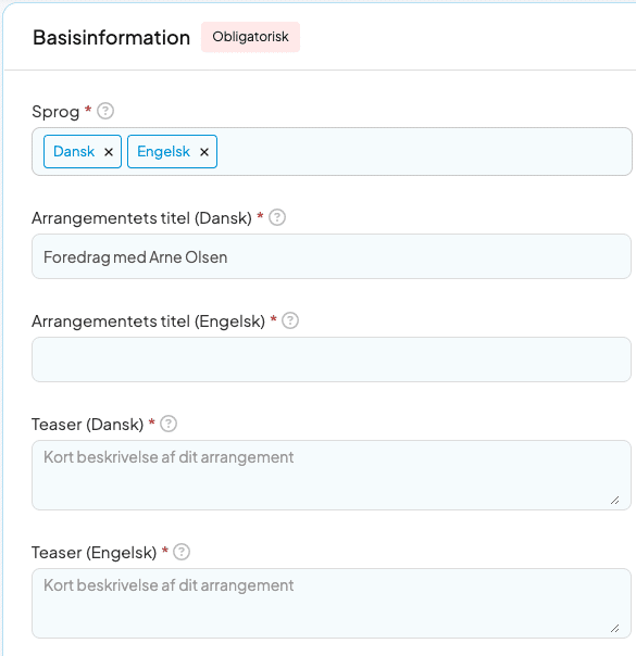 Udover de sædvanlige indstillinger for et arrangement, skal du udfylde diverse tekstfelter. Billetsystemet oversætter desværre ikke automatisk dine manuelt skrevne tekster, når du først har udfyldt et felt for det ene sprog. Det betyder også, at du selv kan vælge, hvordan du vil kommunikere på de forskellige sprog.