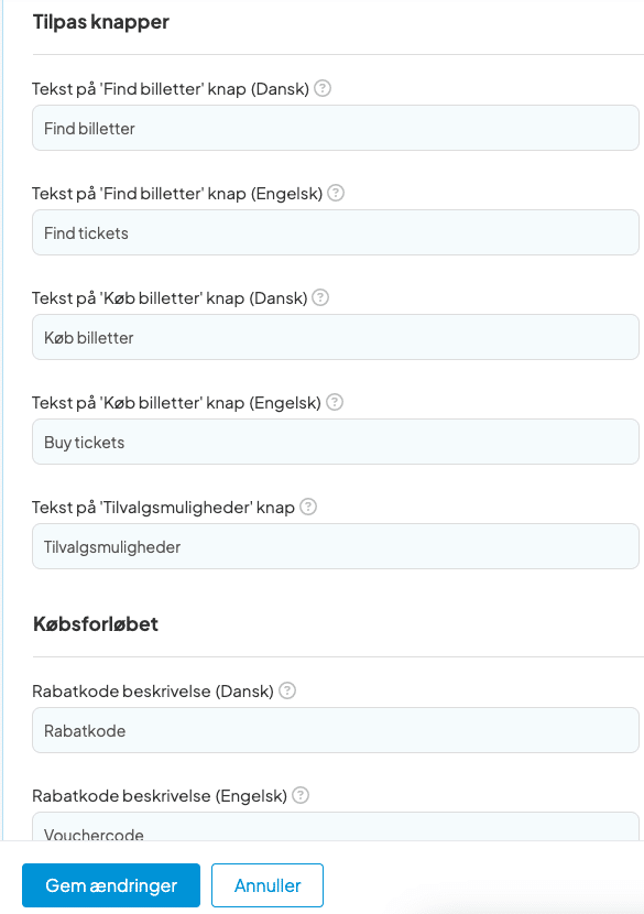 Vær opmærksom på, at funktionen er på nuværende tidspunkt ikke perfekt. Vores standard-billetskabelon er ikke indstillet til at kunne variere alle tekster, kun de tekster der kommer fra ovenstående tekstfelter. Samtidig vil kvitteringsmailen være på det primære sprog.