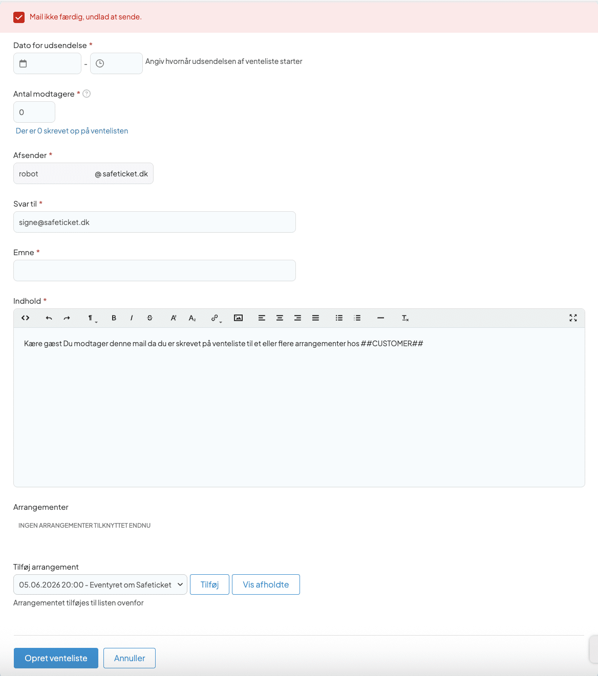 - Når Mail ikke færdig, undlad at sende er vinget af betyder det, at mailen fungerer som en kladde, og først bliver udsendt, når fluebenet fjernes. OBS: fluebenet henviser kun til selve mailen. Det vil sige, at du sagtens kan oprette ventelisten og lade mailen ligge som en kladde, indtil du er klar til at sende den. Ventelisten oprettes, når du klikker Opret venteliste nede i bunden af siden.
