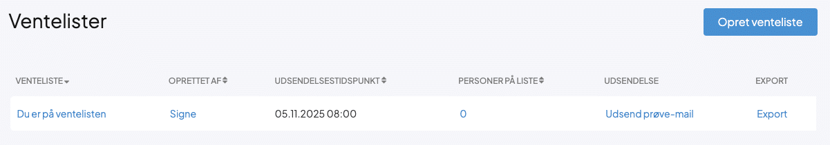 Her har du dit overblik over alle dine oprettede ventelister, herunder navnet på ventelisten, hvem den er oprettet af, udsendelsestidspunkt for mail, antal personer på ventelisen samt muligheden for at udsende en prøvemail og trække en eksport med navnene over de personer, der er på ventelisten. Hvis det er første gang du åbner siden med ventelister, vil siden selvfølgelig være tom.