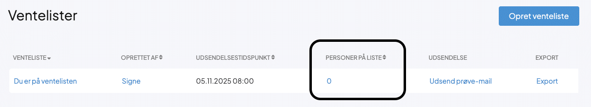 Når du er færdig med at udfylde de nødvendige informationer, klikker du Opret venteliste, og så er ventelisten oprettet.