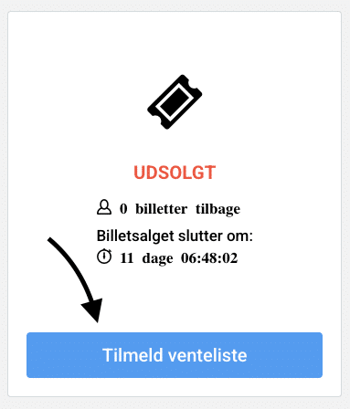 Som billetkøber vil arrangementet se således ud, hvis der er udsolgt, og der er mulighed for at tilmelde sig en venteliste. Her skal de klikke Tilmeld venteliste: